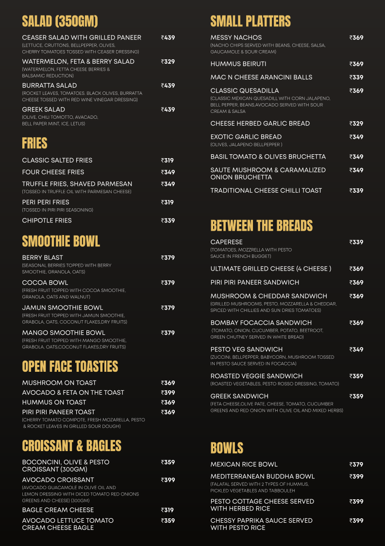 Salads take center stage, featuring options like the zesty Caesar Salad with Grilled Paneer and the refreshing Watermelon, Feta & Berry Salad, each designed to elevate your dining experience. Not to be missed are their gourmet fries, from classic salted to indulgent Truffle Fries, perfect for sharing or enjoying solo.